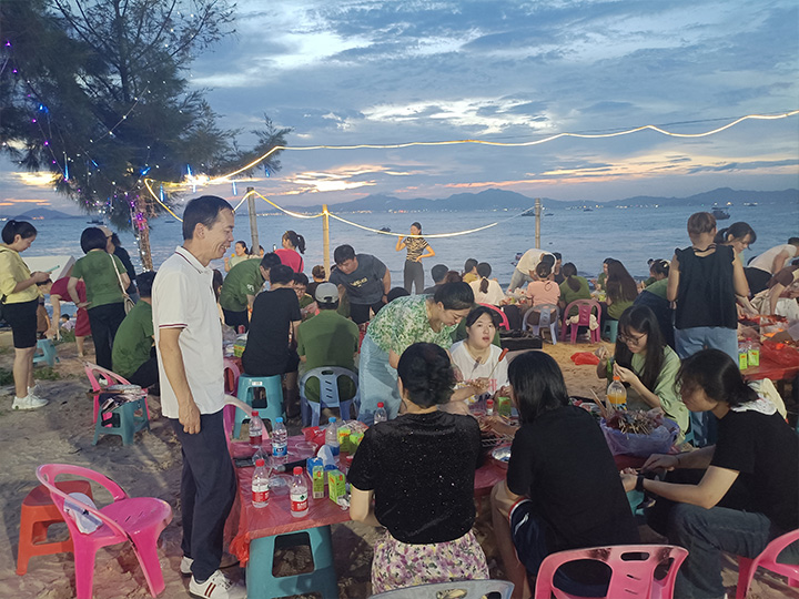晚上海邊自助燒烤,在其樂融融的氛圍下,大口大口的吃肉,敞開放聲大笑。熊熊燃燒的篝火點(diǎn)燃了大家的激情,現(xiàn)場氣氛熱情似火,大家歡快地歌唱、游戲,歡度一個歡樂難忘的夜晚!