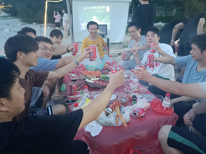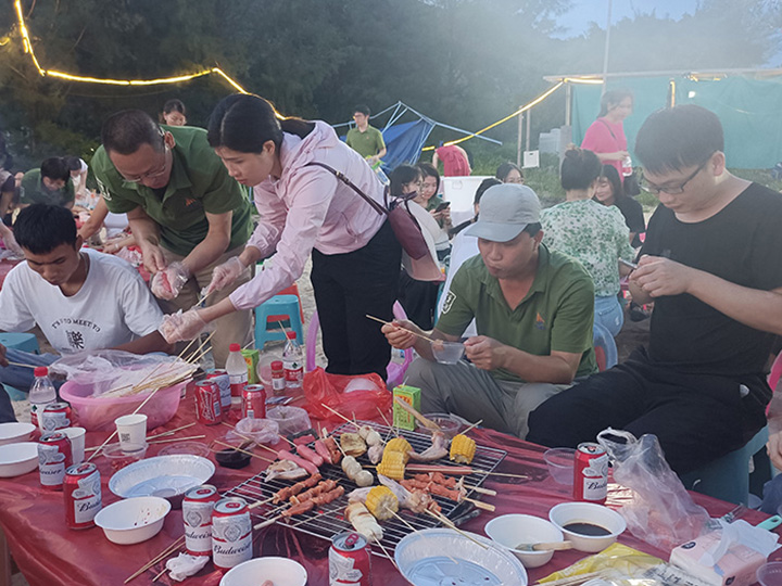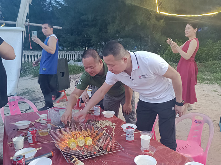 來到本次團(tuán)建的重頭戲海邊BBQ,在此之前伴著夕陽,我們先來個熱身小活動,兩人三足,兩人一組腿部由布條綁牢固,綁好后兩兩接力。大家拼盡全力,為自己的隊伍加油,歡聲笑語之后,嗨起來?。?!