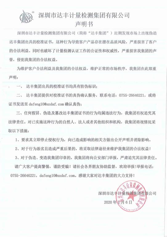 達(dá)豐集團關(guān)于市場出現(xiàn)假證書的聲明